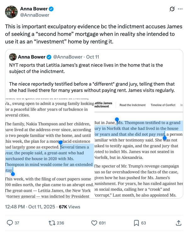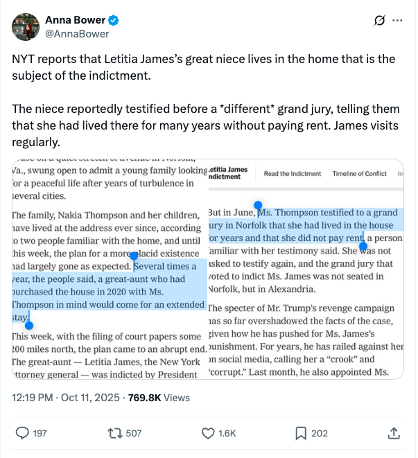NYT reports that Letitia James’s great niece lives in the home that is the subject of the indictment. The niece reportedly testified before a *different* grand jury, telling them that she had lived there for many years without paying rent. James visits regularly.”