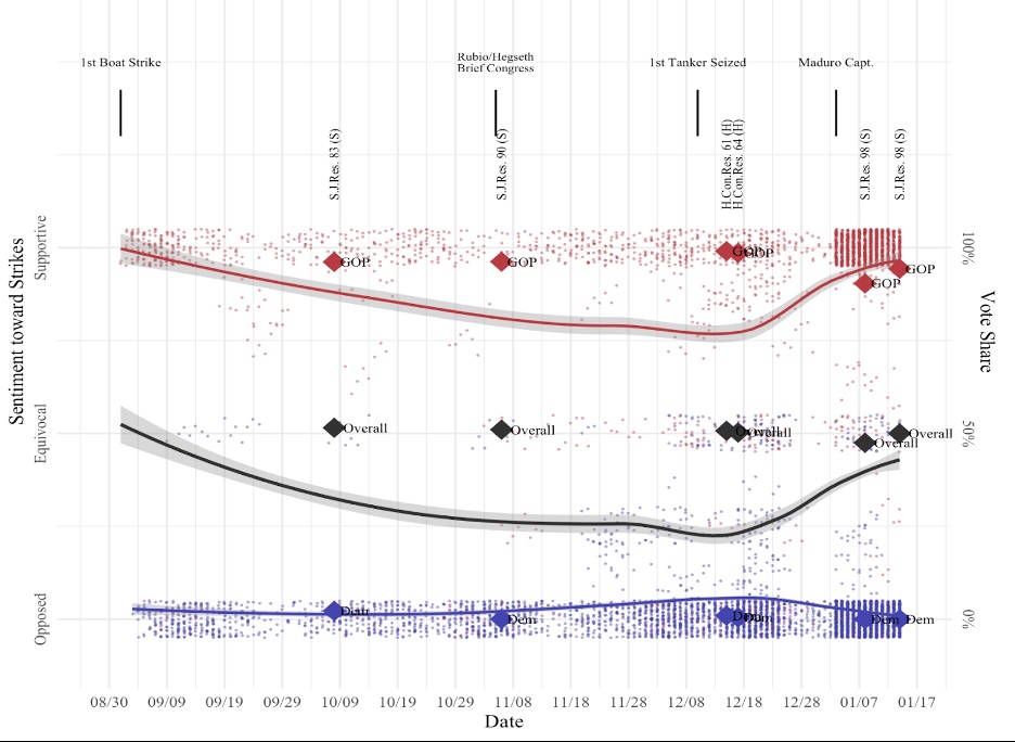Figure 1 presents legislator position-taking toward directly striking Venezuela, by day, since Sept. 9, 2025. Each dot represents a specific legislator’s aggregate expressed sentiment over the prior seven-day period, with blue dots representing Democrats and red dots representing Republicans. We average the expressed stance of legislators who issued more than one statement in a given week—that is why some dots appear between outright positions. We include three smoothed lines that depict average expressed sentiment among Republicans (red), Democrats (blue), and Congress overall (black). We also include vote shares toward several war powers resolutions receiving floor votes over the past four months. Taken together, our empirics provide a “snapshot” of congressional sentiment regarding the use of military force in the crisis.