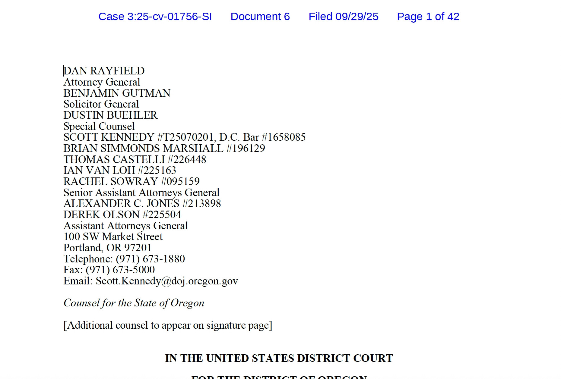 K: ... federal and state power we ask respectfully that court grant TRO. J: if i were to grant, should it be limited to city of portland? is there a specific boundary? K: we are seeking a stay under APA & injunction against Secy Hegseth's Memo. /71