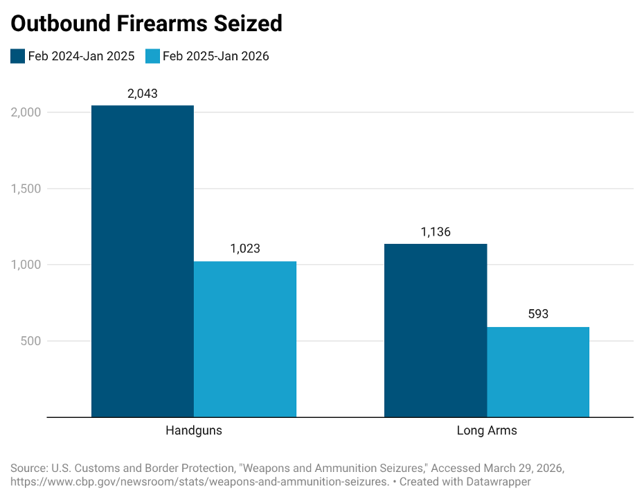 Figure 1. Outbound handgun and long arm seizures, 2024 and 2025.