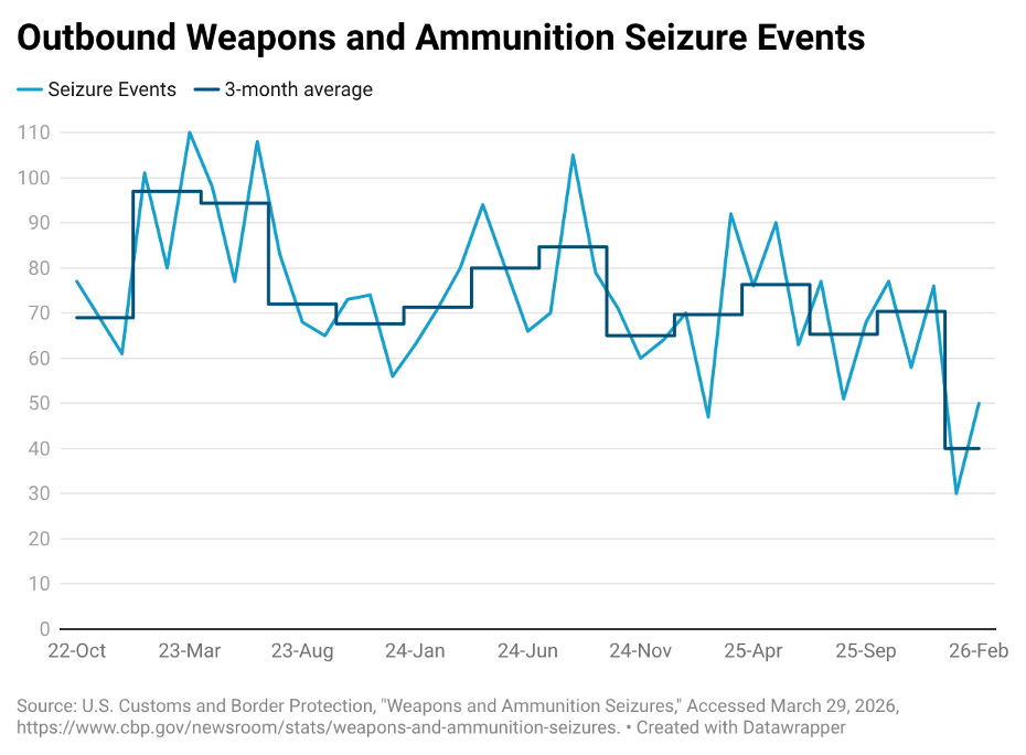 Figure 2. Outbound weapons and ammunition seizure events, October 2022 to February 2026.