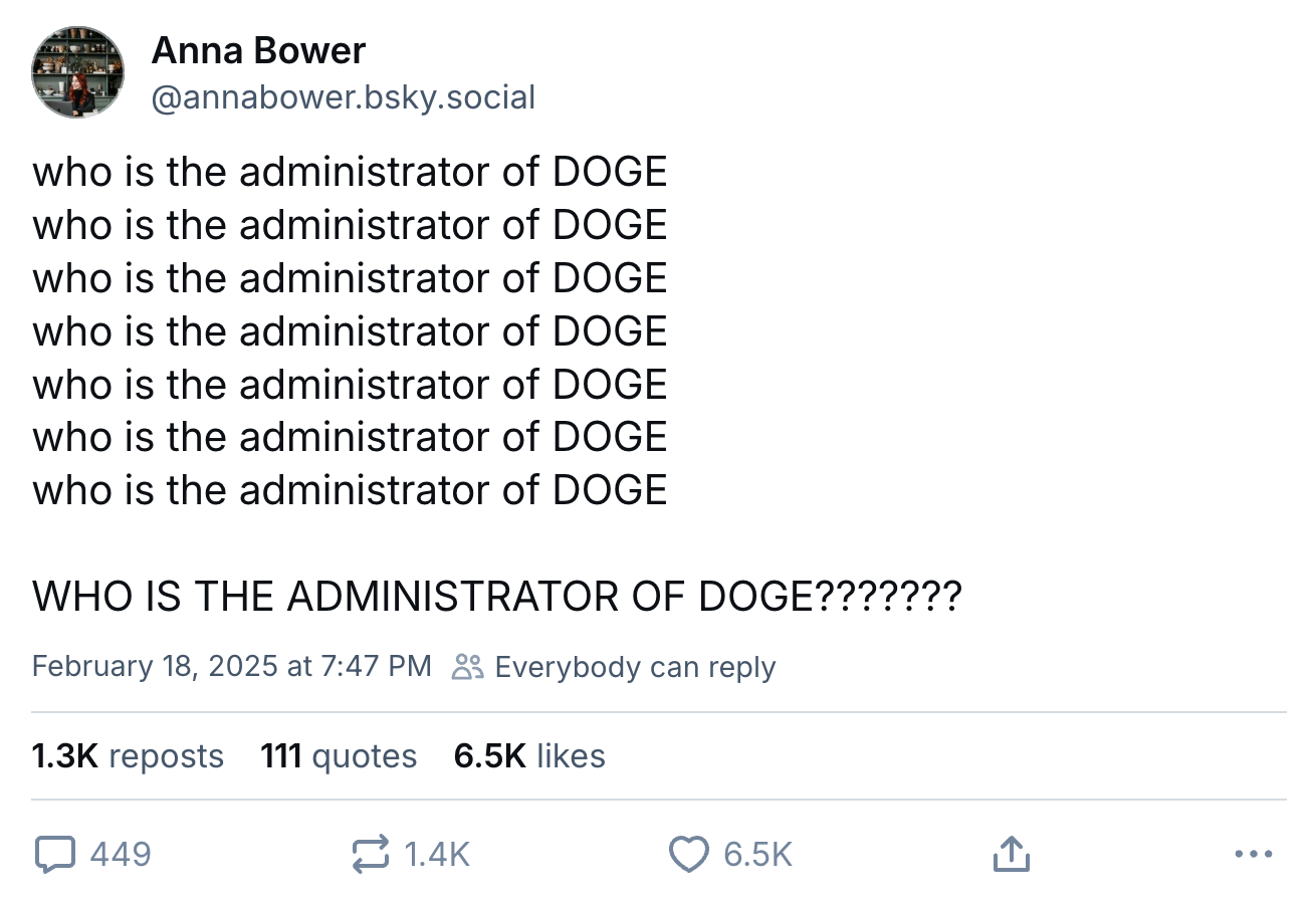 DOGE stands for “Department of Government Efficiency,” which is funny because: (a) it’s not actually a department; (b) it’s not clear that it’s a part of the federal government; and (c) it’s not really about efficiency.